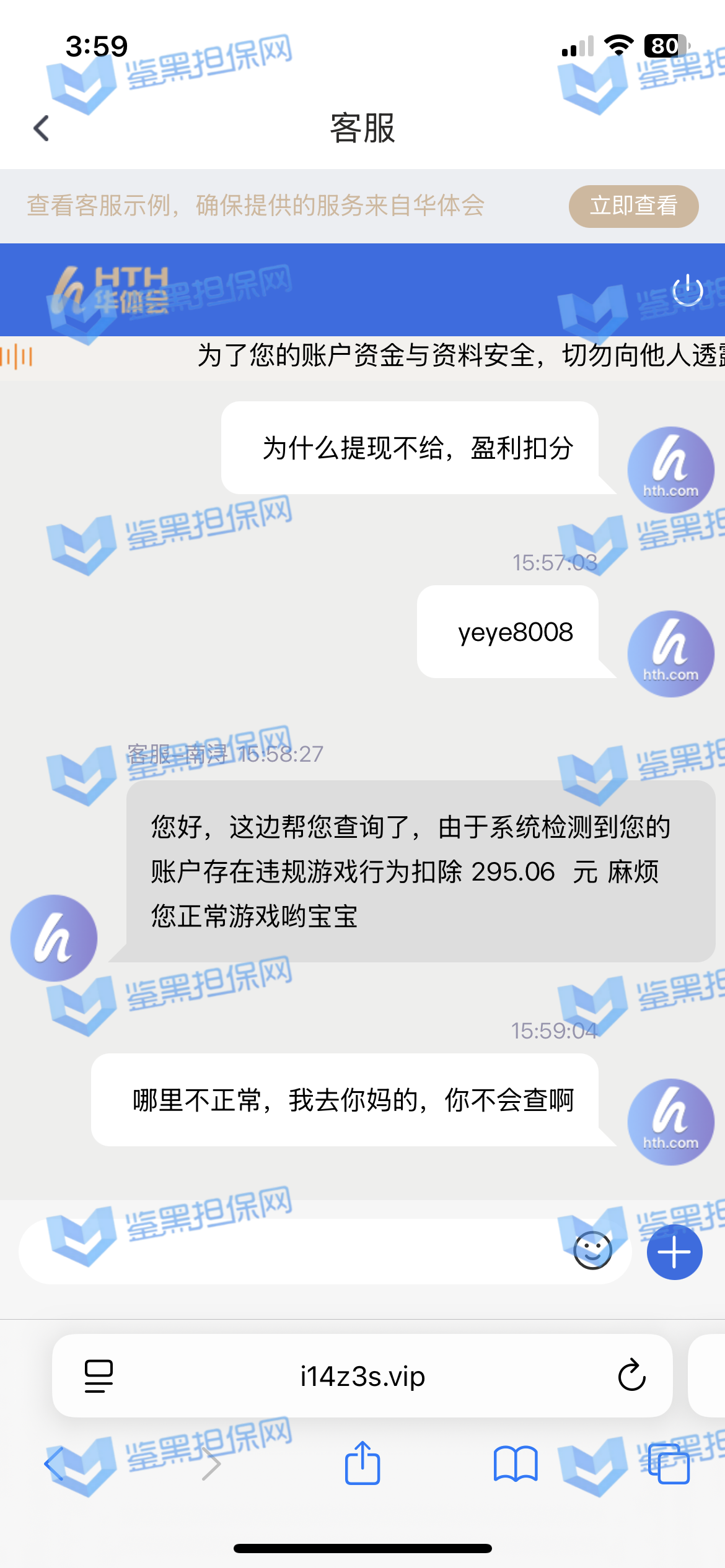 4、维权专员联系该平台相关负责人核实情况,对方表示注单存在异常行为,有群组投注痕迹,维权专员要求提供厅方相关证明复查,此会员存款金额300,提款295也并未盈利,对方无法提供相关证明,直接扣除盈利,可见该种行为存在黑款,且针对存款问题也没有做错正面回复,还请广大玩家远离!!