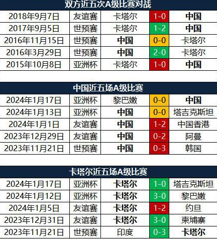 卡塔尔近五场A级比赛战绩